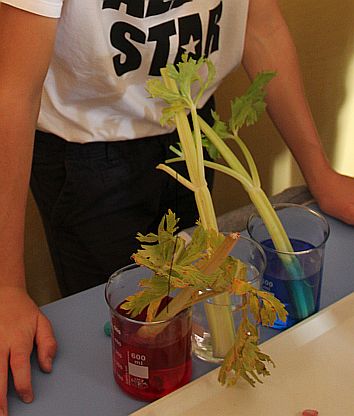 Per dimostrare che il fusto contiene tessuti conduttori che collegano le diverse parti della pianta abbiamo eseguito un semplice esperimento, che i ragazzi spiegano ai visitatori.