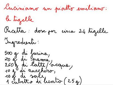Mentre i bambini approfondivano la conoscenza della loro regione, l’Emilia Romagna, interessandosi anche di un cibo caratteristico, le tigelle, la maestra ha fornito la ricetta per ventiquattro tigelle, che sono state confezionate, mangiate e offerte ad alcune insegnanti.