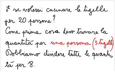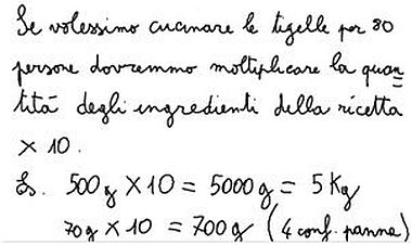 Dopo un lavoro di discussione e di prove di calcolo da parte di alcuni ragazzini, una di loro ha proposto: «Troviamo le quantità per fare le tigelle per una sola persona e poi moltiplichiamo per 20».