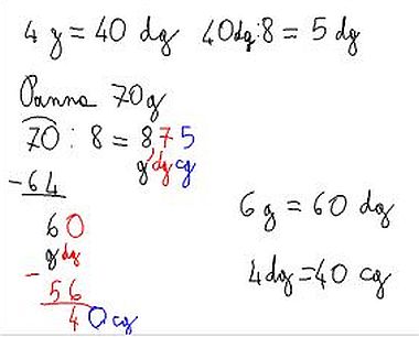 Abbiamo osservato ancora che 4 g sono uguali a 40 dg e (40 dg : 8) sono 5 dg, perciò la virgola serve per separare l’unità di misura (grammo) dal suo sottomultiplo (decigrammo).