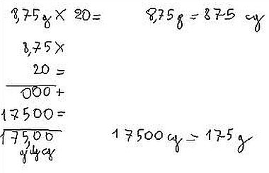 Qui si è presentato un nuovo problema: come si moltiplica per un numero con la virgola? Nel nostro caso, dopo aver effettuato un’equivalenza, abbiamo moltiplicato 875 cg invece di 8,75 g; ma poi ci siamo dovuti ricordare che il risultato del prodotto è in cg (17.500), quindi, per avere di nuovo i grammi, occorreva un’altra equivalenza.