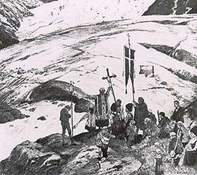 [A sinistra. Piccola Età Glaciale: processione al Ghiacciaio di Mittelberg (Tirolo) per impetrare l’arresto dell’avanzata (disegno di H. Wieland, 1898)]