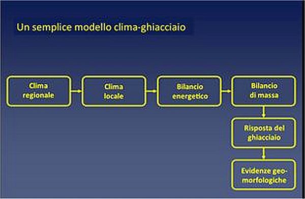 Seguendo un semplice modello qualitativo, si può affermare che l’evoluzione di un ghiacciaio dipende dalle condizioni climatiche globali con i loro effetti sul clima regionale e locale; le variazioni meteo-climatiche producono una modifica del bilancio energetico fra ghiaccio e atmosfera; questo provoca una modifica del bilancio di massa del ghiacciaio (cioè della somma algebrica fra l’entità dell’accumulo e l’entità dell’ablazione); successivamente, con un ritardo che dipende sostanzialmente dalle caratteristiche dimensionali del ghiacciaio, si verifica una sua risposta che si concretizza in una modifica dei suoi parametri geometrici (in particolare, lunghezza, superficie, spessore, inclinazione).
