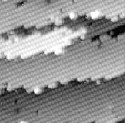 Immagine ad alta risoluzione ottenuta con un microscopio elettronico a scansione delle terrazze atomiche alla superficie di un cristallo. I singoli punti rappresentano ciascuno un atomo e, quindi, la risoluzione di questa immagine raggiunge la scala sub-nanometrica (10-10 metri).