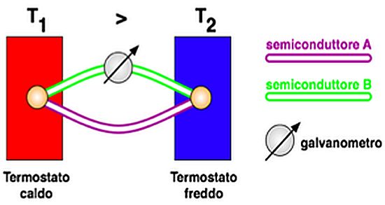 La conversione di calore in energia elettrica è possibile grazie al fenomeno della termoelettricità, per la prima volta descritto scientificamente da Alessandro Volta (1745-1827) in una sua memoria di inizio 1794: mantenendo a temperature diverse due regioni di un circuito chiuso (senza alimentazione!) realizzato con materiale opportuno, si osserva il passaggio di corrente elettrica. Nell’immagine che segue, viene rappresentato lo schema concettuale che descrive il fenomeno.