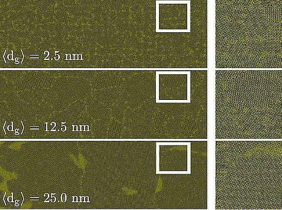 Nell’immagine che segue sono rappresentati tre diversi campioni di una lega di silicio e germanio (materiale con le ottimali proprietà di conduzione elettrica) ottenuti dal procedimento indicato. È interessante notare che, a seconda dei dettagli di processo, la rete dei bordi di grano corrisponde a una granulometria (cioè a una dimensione media dei cristalliti) variabile. Il punto chiave è che tale granulometria non rappresenta una caratteristica fisica intrinseca della lega, assegnata una volta per tutte dalla Natura, ma piuttosto un parametro strutturale totalmente ingegnerizzabile allo scopo.