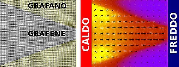 Nell’immagine che segue, a sinistra viene visualizzata (vista dall’alto) una possibile struttura ibrida grafene/grafano con sezione sagomata «a imbuto», mentre a destra viene riportato il calcolo teorico che predice il flusso termico (corrente di calore) al suo interno, per una specifica condizione di termalizzazione: sorgente calda a sinistra e sorgente fredda a destra. È immediato realizzare che la regione funzionalizzata con idrogeno è in buona sostanza esclusa dal trasporto termico.