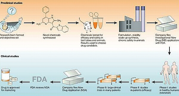 L’immagine che segue mostra in modo esemplificativo il percorso di un farmaco dalla sua ipotesi di partenza, alla sintesi del farmaco, alle verifiche precliniche in vitro e in vivo per la verifica dell’ipotesi di partenza, della sua efficacia in modelli sperimentali e della sua tossicità su organismi viventi.