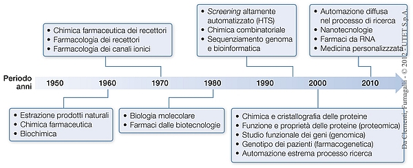 Prima degli anni Cinquanta del secolo scorso i farmaci disponibili erano molto pochi, poco efficaci e con molti effetti collaterali. Solo di alcuni di essi si conosceva il meccanismo d’azione e il loro utilizzo era quindi dettato dalla buona pratica clinica. La rapida crescita delle conoscenze scientifiche e la disponibilità di tecnologie innovative, che hanno caratterizzato la seconda metà del Novecento, hanno contribuito in modo essenziale ai continui profondi cambiamenti nel percorso di ricerca di nuovi farmaci. La schema elenca alcune tappe importanti nella loro successione temporale.