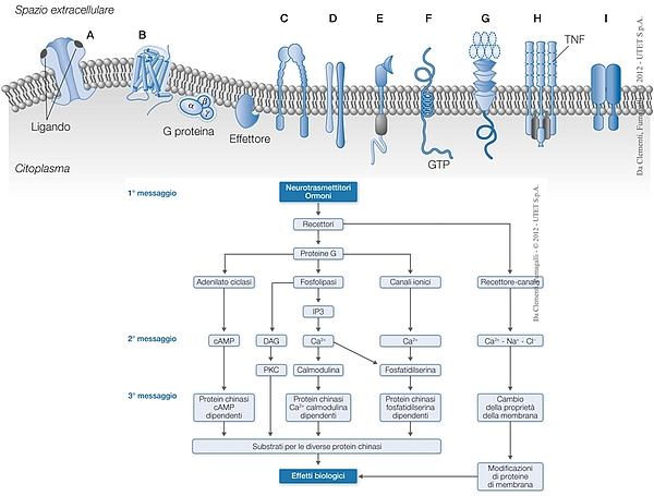 Le classi delle famiglie di recettori di membrana responsabili della comunicazione tra cellule e un esempio della cascata di reazioni biochimiche intracellulari innescata dalla loro attivazione da parte di ormoni e/o neurotrasmettitori (primo messaggero) con l’amplificazione del segnale iniziale attraverso la sintesi di secondi o terzi messaggeri. Dall’interazione iniziale di una molecola con il suo recettore si arriva così alla sintesi di migliaia di molecole che amplificano il segnale. L’effetto biologico finale prodotto dipenderà dalla iniziale interazione ormone-recettore ma soprattutto dalla catena di trasduzione del segnale presente in quella cellula.