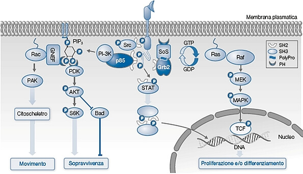 Le vie di trasduzione del segnale per i fattori di crescita di una cellula ben esemplifica la possibilità che uno stesso accoppiamento farmaco-recettore possa attivare funzioni cellulari diverse; in questo caso: movimento, sopravvivenza o proliferazione. Le reazioni intracellulari sono scatenate da fosforilazioni di proteine, la prima delle quali è attuata dalla attivazione di una protein kinasi recettoriale da parte del legame recettore-farmaco. La scelta della funzione attivata dipende da quale tipo di vie di segnalazione è presente in quel momento nella cellula che è determinato dalle esigenze della cellula captate attraverso altre vie recettoriali. Le sigle racchiuse nei cerchi o quadrati identificano le proteine coinvolte, le mezzelune i siti di riconoscimento tra le proteine, P le proteine fosforilate.