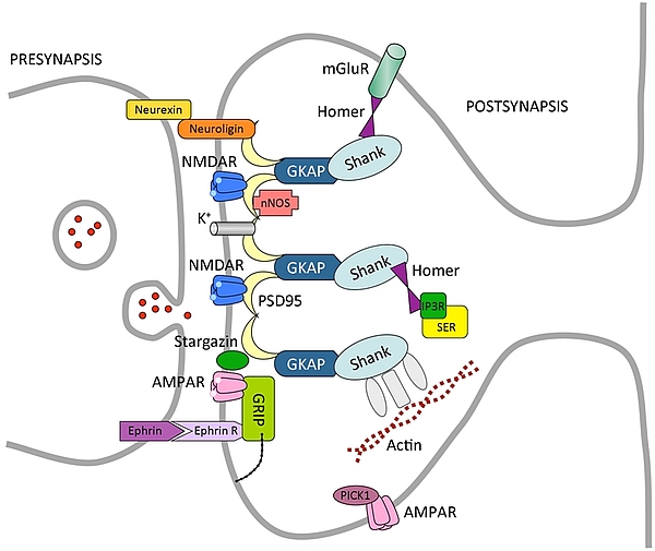 Esempio schematico della localizzazione di recettori in una sinapsi tra neuroni. I recettori (in questo caso per il glutammato, NMDAR, AMPAR) possono essere confinati nella fessura sinaptica assieme ad altre molecole importanti per la trasduzione del messaggio (per esempio stargazina e canali per il potassio K+) e mantenuti in sede attraverso una rete assai complessa di molecole che costituiscono il citoscheletro sinaptico (PSD95, GKAP, Shank, Homer); oppure essere localizzati alla periferia della sinapsi (AMPAR e mGluR). La differente localizzazione rende questi recettori sensibili all’azione di neurotrasmettitori liberati nella sinapsi o provenienti da altre cellule più lontane attraverso il liquido extracellulare.