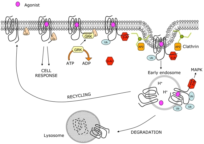 Lo schema presenta un tipico esempio di traffico recettoriale riferito ai recettori accoppiati a proteine G. Dopo l’attivazione del recettore da parte di un agonista recettoriale il recettore attiva la G-proteina con la quale è associato producendo una risposta cellulare. Subito dopo il recettore viene fosforilato e inattivato da una β-arrestina (β-ar) per poi essere internalizzato nella cellula, distrutto nel lisosoma o ricircolato alla membrana. È interessante notare che l’internalizzazione del recettore attiva la β-ar che può essere fonte di un ulteriore segnale intracellulare. I farmaci agonisti diminuiscono il numero di recettori agendo con questo meccanismo.