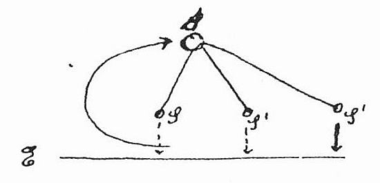 Il polo A rappresenta il polo degli assiomi da cui si possono trarre, per rigorosa deduzione matematica, le conseguenze S, S’, S’’… Sn. Per passare da E ad A non esiste alcun percorso logico, giacché il ramo di parabola che conduce ad A «fluttua» sopra la linea E senza tuttavia aver alcun punto di contatto diretto con il mondo delle esperienze immediate. Quel suo «fluttuare» indica il carattere intuitivo, creativo e anche di fantasia con cui può nascere un percorso di pensiero che ci induce a elaborare gli assioni A.
