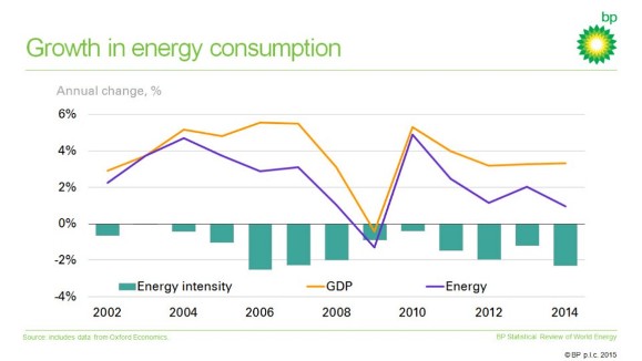 Ma a rendere ancora più interessante la questione c’è il fatto che, come ci mostra l’ultimo grafico, la BP conferma che lo scorso anno la crescita del consumo energetico globale è stata la più bassa dall’inizio del nuovo millennio, fatto salvo il 2008, ed è al livello più basso dalla fine degli anni Novanta. Ora, al netto di tutto questo, cosa spiega l’aumento del 6% in due giorni del prezzo del Wti, ora in area 62 dollari al barile, il massimo da sei mesi? Algoritmi impazziti sui futures? Speculazione? O un gioco geopolitico e geofinanziario a livello globale?