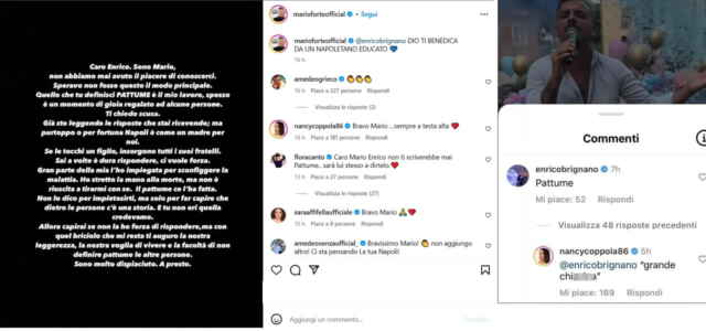 Dopo aver letto il commento di Enrico Brignano, anche Mario Forte è intervenuto in prima persona. “Caro Enrico. Sono Mario, non abbiamo mai avuto il piacere di conoscerci. Speravo non fosse questo il modo principale. Quello che tu definisci pattume è il mio lavoro, spesso è un momento di gioia regalato ad alcune persone. Ti chiedo scusa. Già sto leggendo le risposte che stai ricevendo; ma purtroppo o per fortuna Napoli è come una madre per noi. Se le tocchi un figlio, insorgono tutti i suoi fratelli”, ha scritto il cantante.