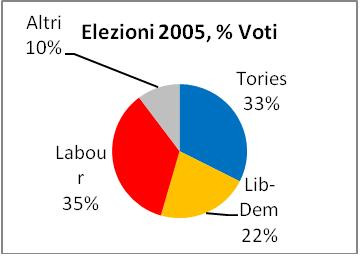 Se un paese è quindi sufficientemente omogeneo, ciò che capita è che il partito di maggioranza relativa ottiene la maggioranza assoluta dei seggi, e governa da solo. Questo è ciò che è sempre capitato in Gran Bretagna. Prendendo ad esempio le elezioni del 2005, le ultime vinte da Blair, abbiamo i Laburisti che riescono ad ottenere il 55% dei seggi con il 35% dei voti.