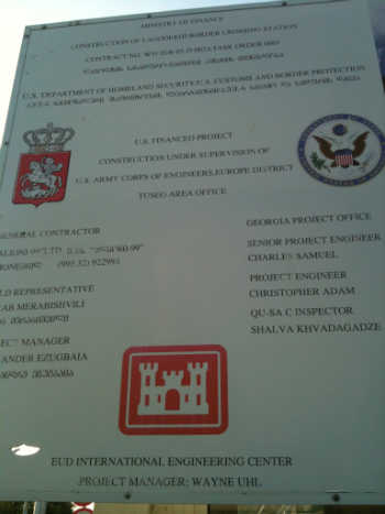 Tra i due check point stanno un centinaio di metri di terra di nessuno, colmati da un ponte su cui sostano una decina tra furgoni, auto e camion dal colore indefinibile e dalla marca improbabile. Tanto il posto di controllo azero sembra essere uscito da un action movie post guerra fredda – di quelli che prospettavano incredibili traffici di armi e minacce terroristiche che, allora, ben prima dell’11 settembre, apparivano fantasiose – tanto quello georgiano ricorda in tutto e per tutto, a parte le dimensioni, il confine tra Messico e Stati Uniti. E in effetti, come spiega con dovizia di particolari un grande cartello multicolore, il check point georgiano è un “dono dell’Esercito degli Stati Uniti”.
