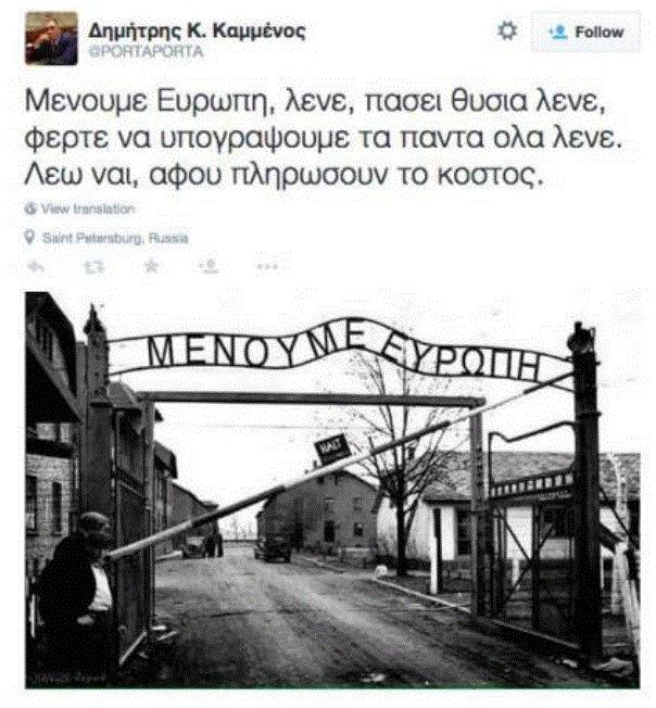 D. Kammenos aveva postato, pochi giorni prima del referendum del 5 luglio, una foto del cancello del campo di concentramento di Auschwitz dove la famosa frase “Arbeit macht frei” (“Il lavoro rende liberi”) era stata sostituita da “Restiamo in Europa” (la foto la trovate a fondo pagina). La didascalia riportava: “Restiamo in Europa, dicono, a qualunque costo. Portate e firmiamo tutto, dicono. Dico, a condizione che ne paghino il costo”. Di più. Sempre in un tweet, definì Alexis Tsipras un “criminale”. Ma era il 2013, tempo in cui né i nazionalisti ortodossi, né i radicali di sinistra, entrambi all’opposizione, immaginavano che due anni dopo avrebbero camminato a braccetto.