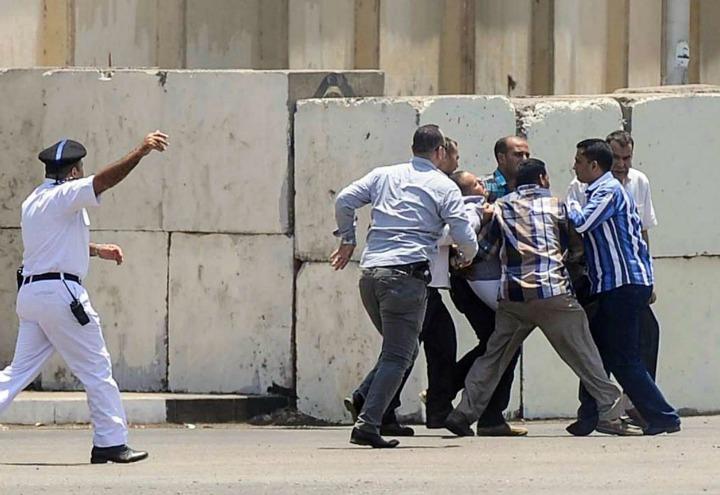 Uomini soccorrono un ferito a Hurghada in Egitto (LaPresse)