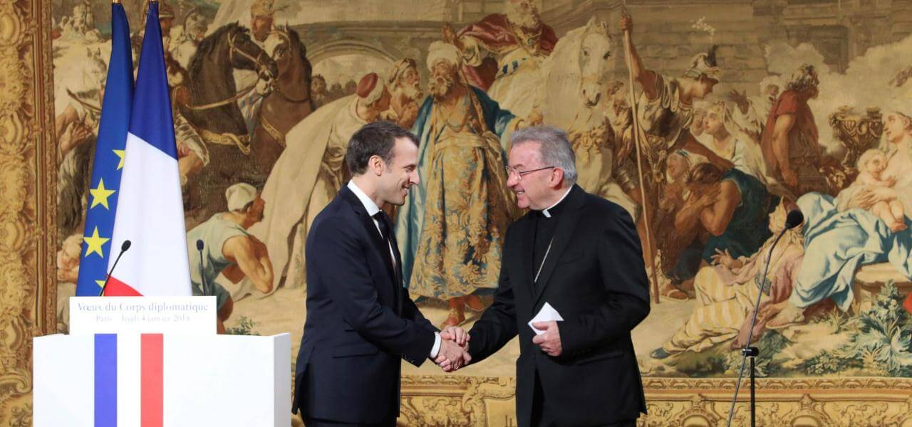 Francia, Macron e il Nunzio Apostolico Mons. Luigi Ventura (LaPresse, 2019)