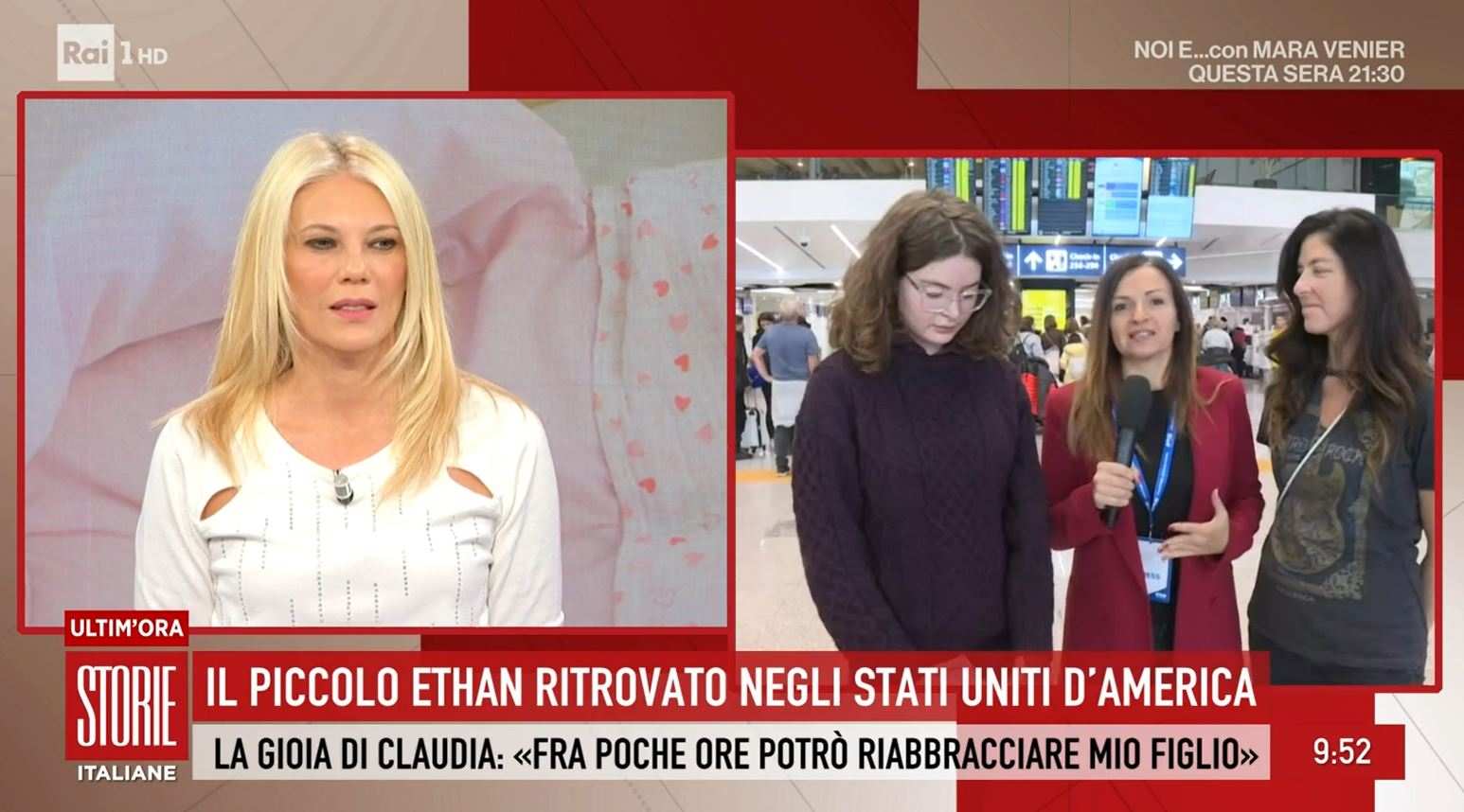 Storie Italiane non poteva che aprire oggi con le splendide notizie riguardanti il piccolo Ethan, il bimbo di pochi mesi che era stato portato negli Stati Uniti dal padre il 30 agosto scorso. Claudia Ciampa, la madre del bimbo, si trova all’aeroporto dove sta per prendere l’aereo per andare appunto a Los Angeles insieme alla figlia maggiore, Chiara. La vicenda si è quindi chiusa in tempi molto ridotti nonostante i casi di “rapimento” internazionale sono solitamente molto complicati: il bimbo è stato trovato assieme al padre e sta bene e a breve potrà riabbracciare la mamma.