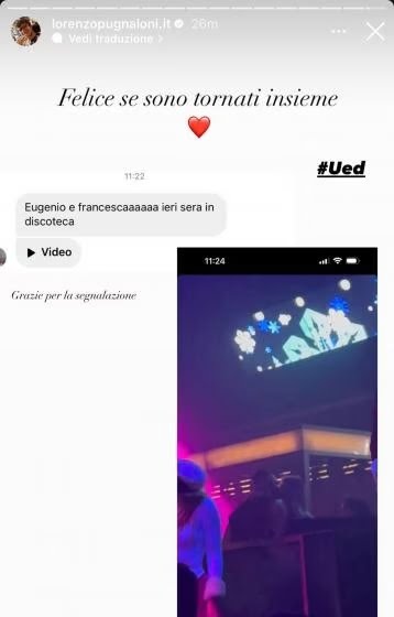 Eugenio Colombo e Francesca Del Taglia sono stati beccati insieme in una discoteca a Firenze. Una segnalazione arrivata a Lorenzo Pugnaloni, e da lui poi pubblicata su Instagram, mostra infatti una foto in cui Eugenio e Francesca si scambierebbero un appassionato bacio. L’utente che ha segnalato l’avvistamento e scattato la foto avrebbe inviato anche un video, che non viene però mostrato. Il bacio tuttavia risulta una prova ben chiara del riavvicinamento tra i due ex, che, ricordiamo, sono genitori di due bambini: Brando e Zeno. Al momento però non sono arrivate smentite o conferme dai diretti interessati.
