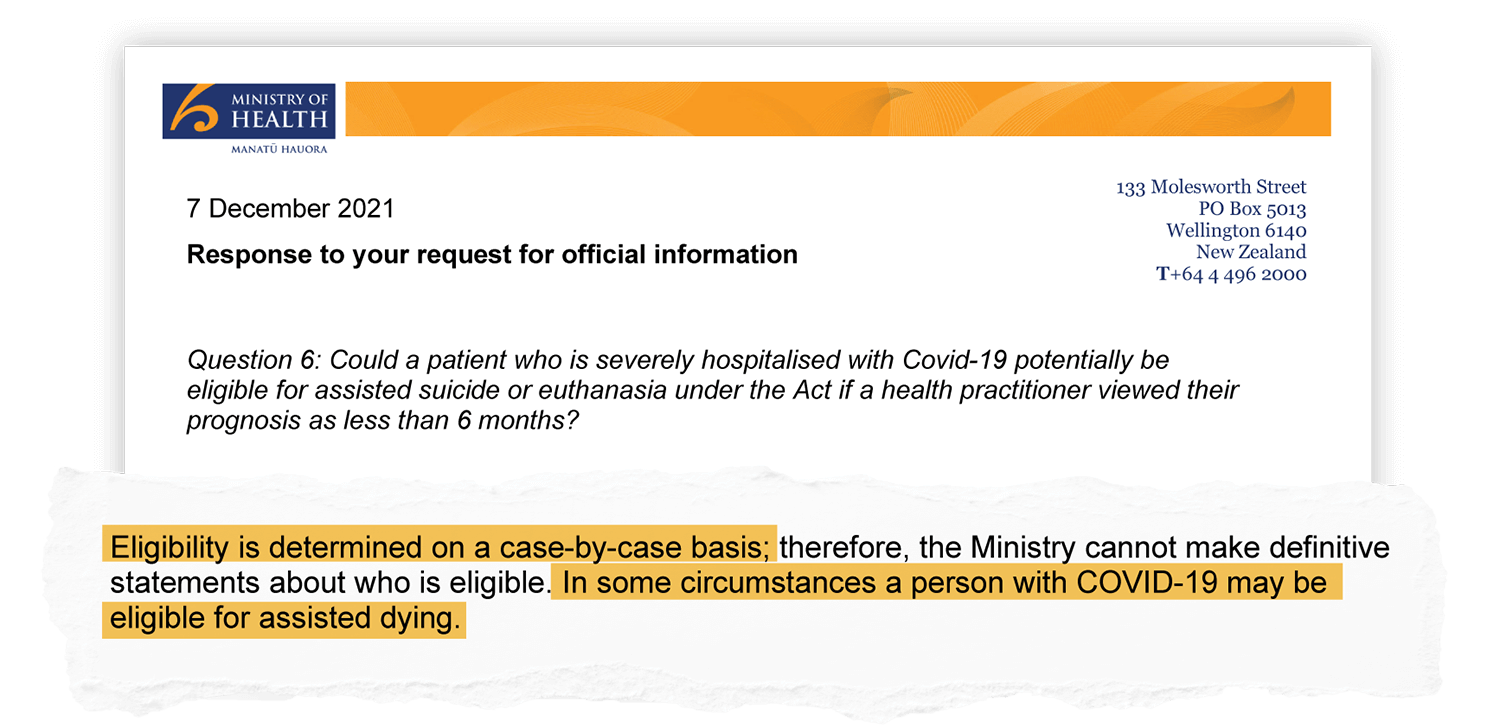 «Ci sono chiari criteri di ammissibilità per la morte assistita. Questi includono che una persona deve avere una malattia terminale che probabilmente porrà fine alla sua vita entro sei mesi», la premessa del Ministero della Salute neozelandese. Inoltre, ha dato una definizione della malattia terminale: «È più spesso una malattia prolungata in cui il trattamento non è efficace. La legge EOLC afferma che l’ammissibilità è determinata dal medico curante (AMP) e dal medico indipendente». Ciò solleva le preoccupazioni dei movimenti pro vita. L’interpretazione è ritenuta vaga: «In primo luogo, non c’è nulla di concreto nella frase “più spesso”, infatti, la sua inclusione in questo specifico contesto sembra chiaramente suggerire che il MOH considera la definizione di malattia terminale soggettiva e aperta all’interpretazione», scrive #DefendNZ. Inoltre, fanno notare che il Ministero della Salute neozelandese «considera il medico curante (AMP) e il medico indipendente come autorizzati dall’EOLCA a prendere la decisione su cosa si qualifichi o meno come malattia terminale».