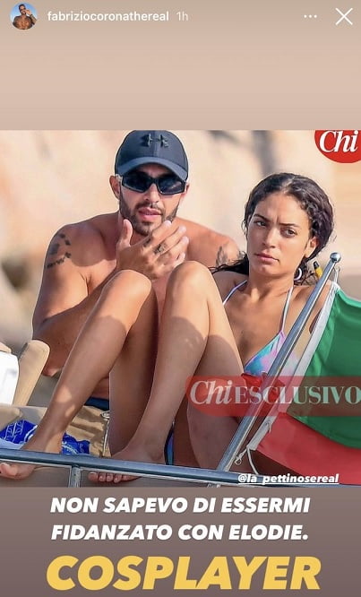 Lo stesso Fabrizio Corona, vista la foto, ha fatto una battuta su Instagram, lanciando una chiara stoccata ad Andrea Iannone: “Non sapevo di essermi fidanzato con Elodie. Cosplayer” ha scritto poi alla fine a caratteri cubitali. Insomma, l’ex re dei paparazzi lancia la frecciatina a colui che, come lui, è un noto ex di Belen Rodriguez.