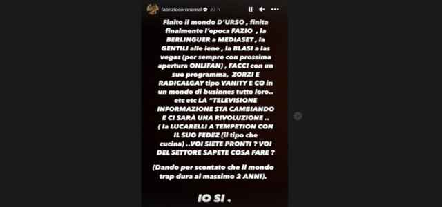 Sarà una stagione televisiva ricca di novità, dunque, quella che comincerà a settembre e sulla quale si è espresso anche Fabrizio Corona che ha commentato quella che definisce “una rivoluzione televisiva” con un post pubblicato tra le storie del suo profilo Instagram.