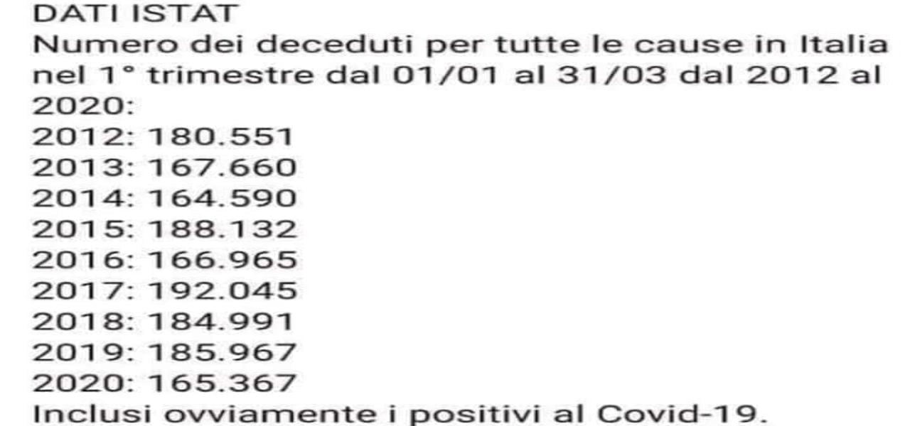 «Ci sono 20.600 morti in meno rispetto all’anno scorso, eppure la percezione è che vi sia un numero di decessi molto maggiore rispetto agli anni precedenti. Qualcosa non torna». Termina così un post in cui vengono riportati i dati fake Istat sui morti per tutte le cause in Italia nel primo trimestre di ogni anno dal 2012 al 2020. Si tratta di una bufala che da giorni rimbalza sui social, da Facebook a WhatsApp. L’idea di fondo è che ci siano meno morti, eppure si sia creato allarmismo a causa del coronavirus. Peccato che le cose non stiano affatto così. Dal primo aprile, come riportato da Butac, l’Istat sta rilasciando con cadenza settimanale i dati aggiornati sui morti in Italia. Chiaramente non è possibile fare una netta distinzione tra i decessi legati al Covid-19 e quelli per cause naturali, perché c’è il grande problema delle persone morte con sintomi riconducibili al coronavirus a cui però non è stato fatto il tampone. In ogni caso è possibile smontare i numeri diffusi in questo messaggio che sta girando in Rete.