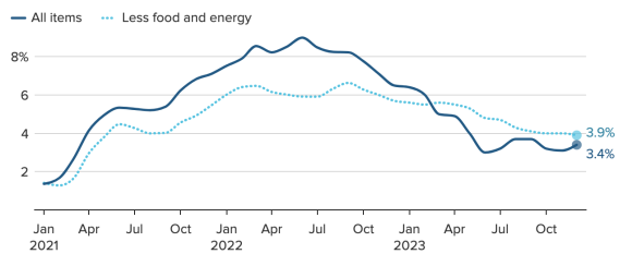 Durante il pomeriggio di giovedì 11 dicembre è stato rilasciato il dato sull’inflazione americana relativo a dicembre 2023, che si è attestato annualmente al 3,4%, in accelerazione rispetto al 3,1% registrato a novembre 2023, subendo un incremento mensile dello 0,3% e battendo le aspettative degli analisti che prevedevano un CPI al 3,2%.