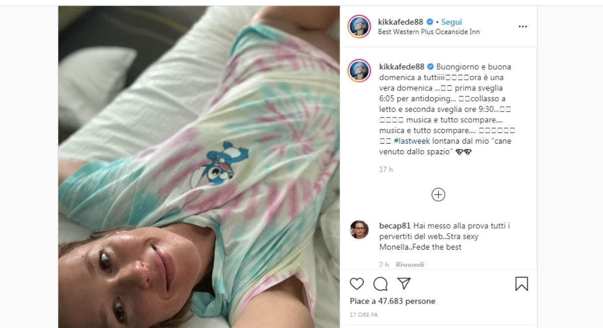 Unpost pubblicato su Instagramnella giornata di ieri dalla campionessa di nuoto Federica Pellegrini, ha catalizzato l’attenzione per qualche ora. La bella nuotatrice veneta si è infatti mostrata sul letto appena sveglia, con addosso solo una maglietta e degli slip. “Buongiorno e buona domenica a tuttiiii – la didascalia a corredo dell’immagine pubblicata sui social – ora è una vera domenica … prima sveglia 6:05 per antidoping… collasso a letto e seconda sveglia ore 9:30… musica e tutto scompare…. musica e tutto scompare…. #lastweek lontana dal mio ‘cane venuto dallo spazio’”. Fin qui nulla di strano se non che la Federica nazionale abbia deciso di indossare delle mutandine color carne. Un particolare che non è sfuggito ai più, soprattutto ai maschietti, che già si erano scatenanti ipotizzando che la nuotatrice non indossasse alcuna biancheria intima, facendolo notare per sbaglio in foto. Dopo un tam tam mediatico alla fine è stato svelato l’arcano: gli slip della Fede c’erano, ed erano appunto di color carne.