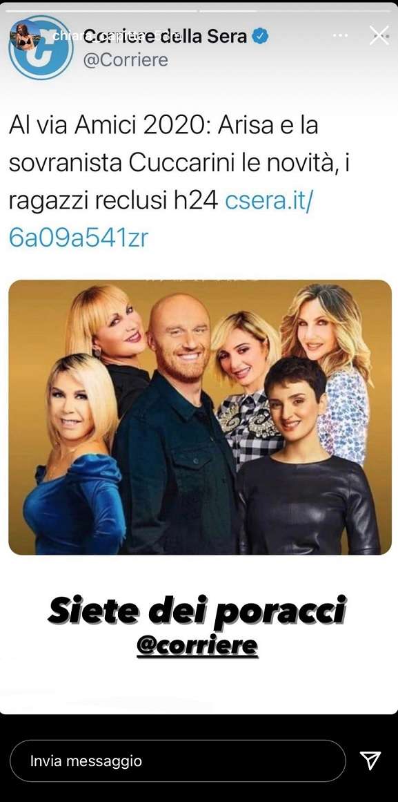 “Al via Amici 2020: Arisa e la sovranista Cuccarini le novità, i ragazzi reclusi h24”. È questo il titolo di un articolo del Corriere della Sera che ha fatto storcere il naso ad alcuni lettori, una in particolare: Chiara Capitta. Stiamo parlando della figlia di Lorella Cuccarini, quest’anno nella commissione di ballo del talent condotto da Maria De Filippi, definita dal Corriere in questo titolo “sovranista”. Un appellativo già affiancato altre volte alla conduttrice e da lei stessa commentato in un’intervista rilasciata qualche tempo fa al settimanale Chi. Eppure il modo di presentare la Cuccarini nel suo nuovo ruolo di professoressa di Amici, riportando alla luce la questione e tornando ad etichettarla, ha fatto infuriare la Cipitta che su Instagram ha riportato la notizia con tanto di replica al Corriere: “Siete dei poracci!”