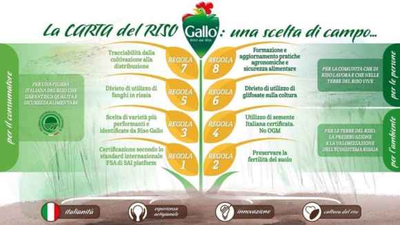 Un’iniziativa complessa e articolata, quindi, nella quale si inserisce a pieno titolo la “Carta del Riso”, un sintetico e intuitivo promemoria recentemente presentato da Riso Gallo per ricordare a tutti le buone pratiche quotidiane, che possono contribuire in maniera significativa ad andare incontro alla richiesta di sostenibilità quale strumento chiave per la tutela e la valorizzazione di territorio e ambiente. Un obiettivo che – sostiene l’azienda – si può raggiungere solo attraverso un approccio responsabile e consapevole, condiviso tra tutti gli attori della filiera: una “scelta di campo” insomma a vantaggio del consumatore, sviluppata secondo otto direttrici, che puntano alla certificazione e alla tracciabilità, passando per la tutela del suolo e dei prodotti e per la selezione delle sementi italiane non Ogm e delle varietà di riso più performanti per ridurre le emissioni di gas serra. Il tutto senza dimenticare la formazione e l’aggiornamento continuo circa le pratiche agronomiche e la sicurezza alimentare. Un punto nevralgico, quest’ultimo, che prevede anche la messa a disposizione delle aziende agricole da parte di Riso Gallo di strumenti per migliorare la biodiversità e ridurre l’inquinamento delle acque, e per la razionalizzazione dell’uso di mezzi tecnici attraverso l’utilizzo di tecnologie satellitari.