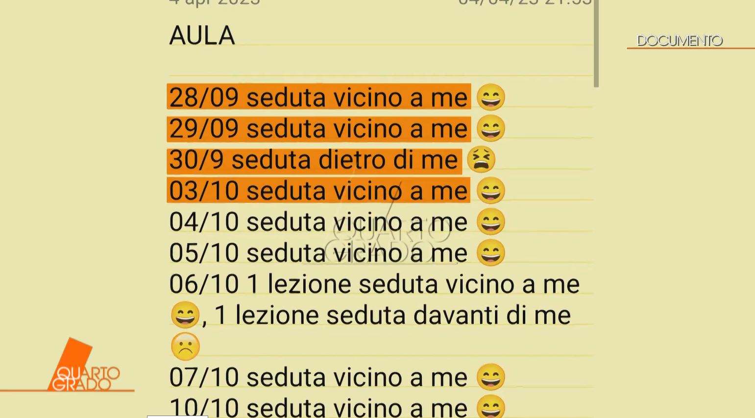 Quarto Grado continua a trattare il caso di Filippo Turetta, il giovane ragazzo di Padova che ha assassinato un anno fa la povera Giulia Cecchettin. Durante la puntata di ieri il talk di Rete 4 condotto da Gianluigi Nuzzi ha mandato in onda i diari dello stesso Filippo Turetta, dove il giovane annotava di tutto e di più in merito appunto alla sua ex fidanzata. “Seduta vicino a me, davanti a me o dietro di me”. Filippo Turetta aggiorna una lista nel suo cellulare che si chiama “dove sta seduta” e riporta appunto dove si siede Giulia Cecchettin ogni giorno all’università. Ma Giulia aveva già lasciato Filippo da mesi, e si tratta solo di una delle 20 liste che lo stesso Filippo Turetta ha nel proprio telefono.