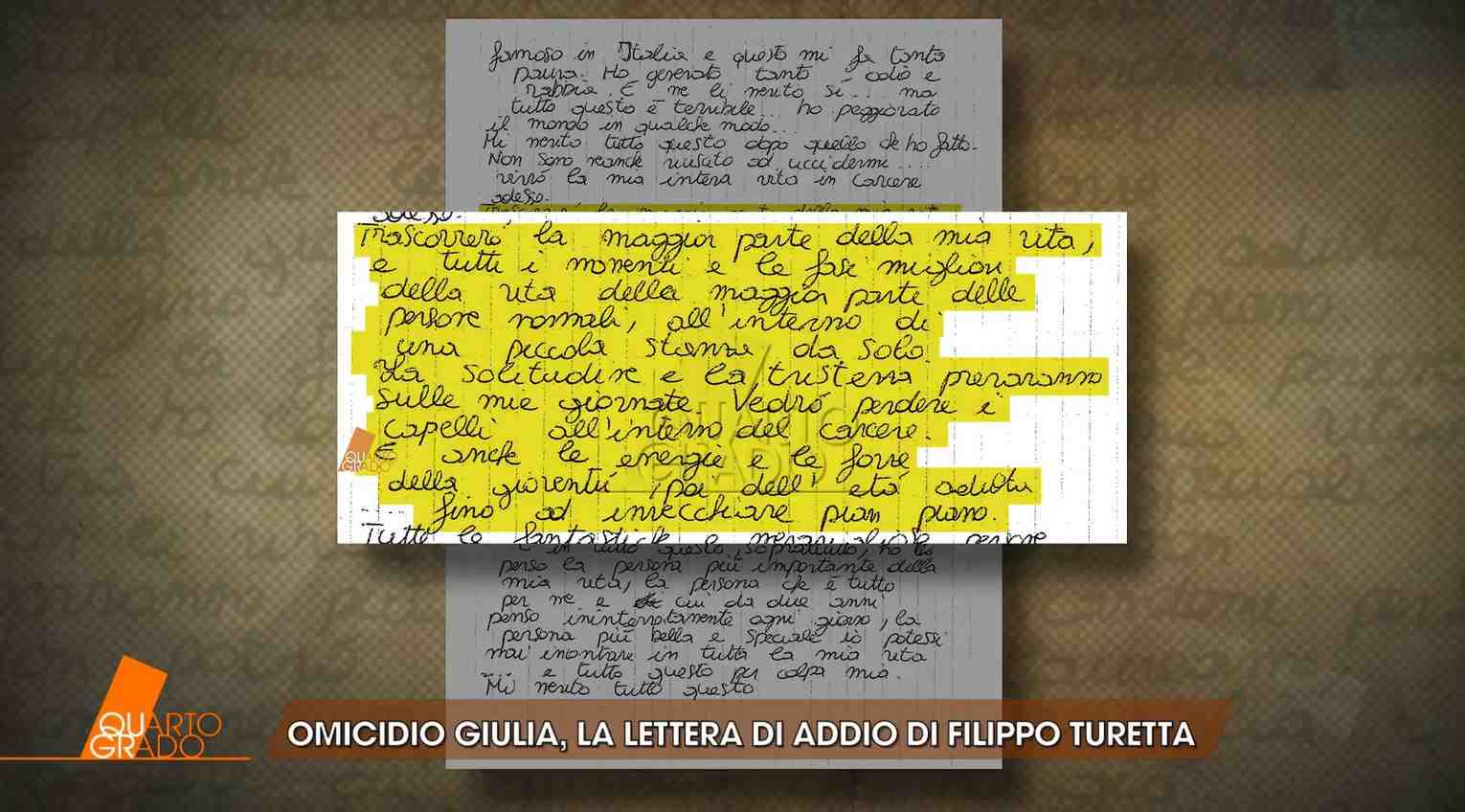 Filippo Turetta ha scritto una lettera di addio ai genitori nel carcere tedesco, dopo essere arrestato in Germania e dopo aver commesso l’omicidio della povera Giulia Cecchettin. Se ne è parlato ieri sera a Quarto Grado, specificando alcune delle parole scritte dallo stesso assassino sulle 4 pagine di fogli A4, come ad esempio quando spiega di essere “stato alcuni giorni con un coltello alla gola o al torace, ma non ce l’ho fatta forse perchè mi fa senso o la violenza mi fa paura”. Filippo Turetta scrive che non avrebbe mai voluto uccidere Giulia, dicendosi disperato.