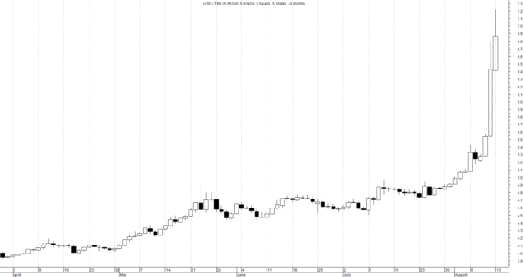I rispettivi grafici sono emblematici nonostante i contesti politici ed economici siano stati (ovviamente) diversi. La crisi della moneta turca è iniziata al termine della settimana per successivamente inasprirsi in apertura della successiva: da 5,275 è balzata a 7,215 (anche in questo caso una variazione di oltre 37 punti percentuali).