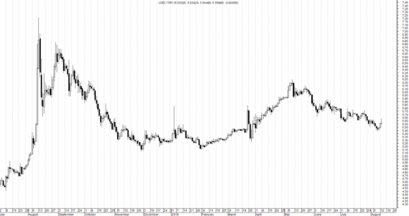 Preso atto di questa curiosa correlazione grafica, e affidandosi all’assunto che tale andamento si potrebbe verificare anche per il futuro (v. “la storia si ripete”), diventa obbligatorio osservare la successiva dinamica di prezzo che ha interessato la stessa lira turca (v. grafico).