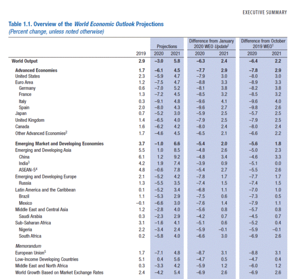 Il dato era atteso ma ancor più il suo ammontare: il Fondo monetario internazionale ha diffuso il consueto rapporto sull’economia mondiale “World Economic Outlook” decretando la recessione su scala globale. Nel documento, che in questa edizione riporta il titolo “The great lockdown“, viene stimata una crescita negativa a quota -3% rispetto al precedente stimato incremento di oltre tre punti percentuali (+3,3%). Consultando i dati dei singoli Paesi, si apprende, ancora una volta, come l’Italia occupi il gradino più basso: per l’anno in corso la proiezione vede un saldo negativo al 9,1% mentre, per il successivo 2021, si attesta a un incremento del 4,8%.