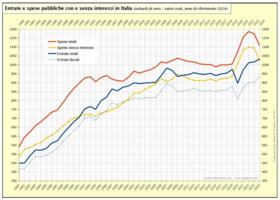 Come si può osservare nel seguente grafico, la dinamica della spesa al lordo e al netto degli interessi è sempre cresciuta.