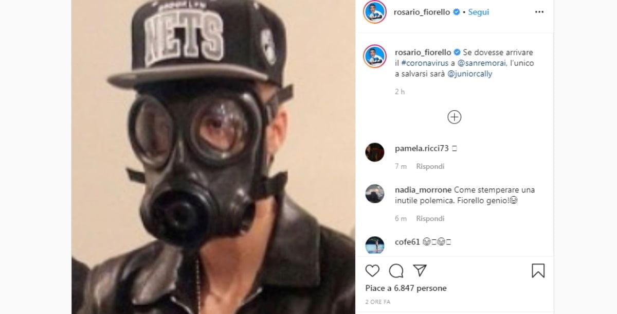 Nuovo post di Rosario Fiorello su Instagram. Il noto conduttore televisivo ha pubblicato una foto per trattare due argomenti molto caldi, leggasi le polemiche legate alla partecipazione di Junior Cally al Festival di Sanremo, nonché il coronavirus, il misterioso virus cinese che ha provocato <strong>41 morti, e che è recentemente giunto anche in Europa. Il mitico Fiore deciso di pubblicare sulla sua pagina uno scatto proprio di Junior Cally, che come molti sanno, è mascherato. Nello scatto di Fiorello si vede lo stesso artista con addosso una maschera anti-gas, di quelle che si usavano in caso di radiazioni nucleari o di gas nocivi, anni fa: “Se dovesse arrivare il #coronavirus a @sanremorai – commenta ironico Fiorello – l’unico a salvarsi sarà @juniorcally”. Una foto che ha fatto incetta di like e che nel contempo ha ricevuto migliaia di commenti.