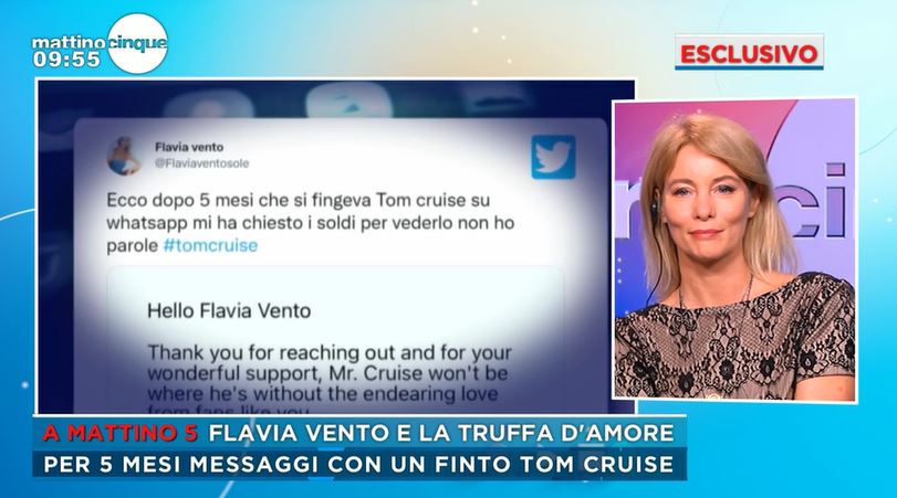 Fra gli ospiti di stamane del programma Mattino 5, classica striscia mattiniera condotta da Federica Panicucci e Francesco Vecchi, vi era anche la showgirl e attrice Flavia Vento. Quest’ultima è finita al centro delle cronache delle ultime ore, dopo aver ammesso via social, precisamente su Instagram, di essersi fatta “truffare” da una persona che lei credeva fosse Tom Cruise, il divo hollywoodiano. Un imbroglio che è durato in totale cinque mesi ma che fortunatamente non ha avuto conseguenze “gravi”, almeno dal punto di vista economico: “E’ iniziato a maggio – ha raccontato – avevo messo sul profilo vero di Tom Cruise, quello con la spunta blu, un commento sull’uscita del nuovo Top Gun e avevo scritto che non vedevo l’ora di vedere il film. Dopo qualche giorno mi arriva un messaggio su Twitter da un profilo che si firmava Thomas Mapother Cruise, che sarebbe il vero nome dell’attore, ringraziandomi per il mio supporto, che era anche la stessa frase che usava il profilo vero di Tom Cruise. Allora gli ho scritto, in inglese, se fosse veramente lui, e mi risponde yes of course, e mi ha lasciato il suo numero di telefono e abbiamo iniziato a scriverci fino ad una settimana fa praticamente”.