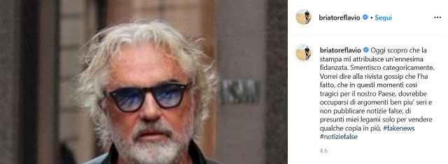 Flavio Briatore smentisce categoricamente di avere una nuova fidanzata. Il settimanale Chi, nell’ultimo numero in edicola, ha diffuso la notizia del presunto, nuovo fidanzamento del manager. Secondo il magazine diretto da Alfonso Signorini, nella vita di Briatore ci sarebbe una nuova ragazza, Dana: notizie che, tuttavia, Briuatore smentisce con foza attraverso i suoi canali social. Sulla sua pagina Instagram, infatti, Briatore si scaglia nuovamente contro i giornali di gossip smentendo l’ennesima notizia sulla sua vita privata, esattamente com’è accaduto con altri scoop. “Oggi scopro che la stampa mi attribuisce un’ennesima fidanzata – ha scritto sul suo profilo Instagram -. Smentisco categoricamente. Vorrei dire alla rivista gossip che l’ha fatto che, in questi momenti cosi tragici per il nostro Paese, dovrebbe occuparsi di argomenti ben più seri e non pubblicare notizie false, di presunti miei legami solo per vendere qualche copia in più #fakenews #notiziefalse #giornalismospazzatura”.