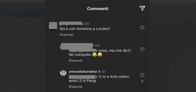 Dall’altra parte, inoltre, Antonella Fiordelisi ha ribadito ancora una volta di avere un semplice rapporto di amicizia con Antonino Spinalbese e l’ha fatto rispondendo al commento di un utente sotto il suo post di Instagram. “Ma è con Antonino a Londra?”, ha chiesto un utente commentando le sue ultime foto scattate a Londra e la risposta della Fiordelisi è stata – “Io e Antonino siamo amici e lui è a Parigi”.