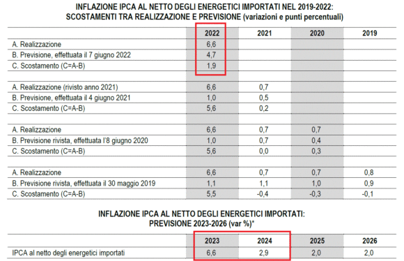 Guardando a questi dati, e soffermando l’attenzione agli ultimi (rif. 2025/2026), viene specificatamente indicato come «Per il biennio 2025-2026 lo scenario di previsione incorpora una ipotesi tecnica di stabilizzazione del prezzo all’importazione dei beni energetici sui livelli attuali». Pur prendendo atto di questa indicazione, anticipare, oggi, ovvero di oltre tre anni, quello che porrebbe essere (rif. la previsione) appare alquanto impensabile: ancor più se, alla base, viene impiegata una ipotesi tecnica di «stabilizzazione del prezzo» su «livelli attuali». Ovviamente comprendiamo la ratio in ambito teorico-previsionale, ma, oggettivamente (rif. la pratica), questo futuribile scenario appare eccessivamente aleatorio. Pertanto, almeno chi scrive esclude volutamente una valutazione in merito a questo idealizzato biennio 2025-2026.