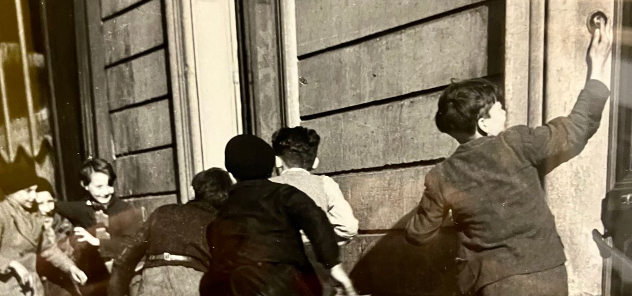 Cosi, accanto alle giovani donne un po’ sfacciate che si godono il sole sedute ai tavolini di un caffè di rue Boulard, ai due impacciati gentiluomini che si tengono la bombetta in rue Royale per evitare che una folata di vento autunnale la porti via, all’ultimo valzer di una coppia che festeggia il 14 luglio, ai raccoglitori di carbone lungo il canale Saint Denis, al corteo nuziale in marcia su una strada di campagna e alla signora di Bercy attorniata dai gatti, nella mostra genovese spiccano le numerose fotografie firmate da Doisneau in cui sono protagonisti i fanciulli, ritratti con simpatia e quasi sempre con una leggera arguzia. Ci colpiscono la compostezza e l’attenzione dei piccoli alunni seduti ai banchi di scuola e l’attraversamento della strada di un buffo gruppo di bambini che si tengono per il grembiulino, mentre ci fanno sorridere i monelli che suonano furtivi il campanello di un’abitazione per poi scappare a gambe levate e i due fratelli che da autentici acrobati camminano con destrezza reggendosi sulle mani in rue du Docteur Lecène, fino alla gioiosa scena dei piccoli che ballano in cortile durante la ricreazione.