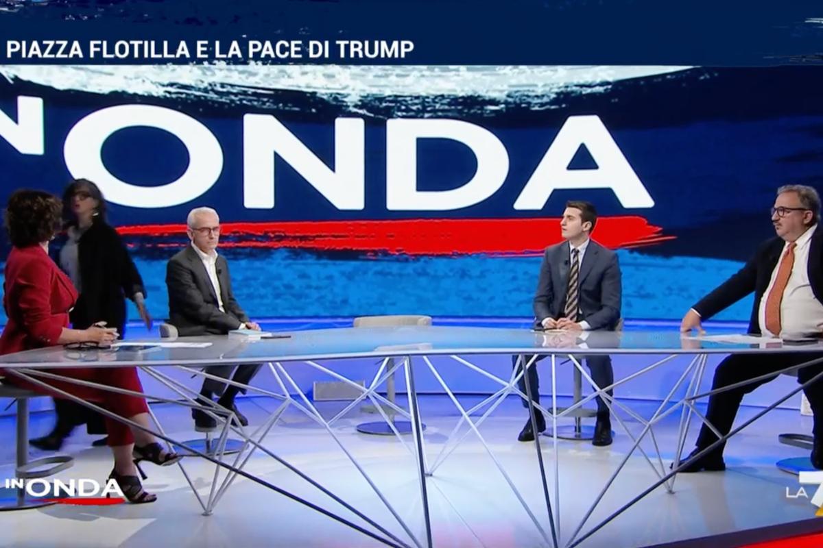 Appena poche ore dopo che il conduttore di “InOnda” Luca Telese, con un’altra lite “classica” in tv, aveva abbandonato lo studio della sua collega a La7 Gaia Tortora per una furiosa discussione con il giornalista Daniele Capezzone, la sera si trova ad ospitare con la co-conduttrice Marianna Aprile un nuovo talk sul caso Flotilla e sul piano di pace di Trump per la fine della guerra tra Israele e Hamas. E qui con gli ospiti Fubini e Giubilei è presente anche Francesca Albanese, responsabile di un report alle Nazioni Unite contro le violenze dello Stato Ebraico contro il popolo palestinese e sempre più “madrina” della sinistra italiana sul tema Gaza.