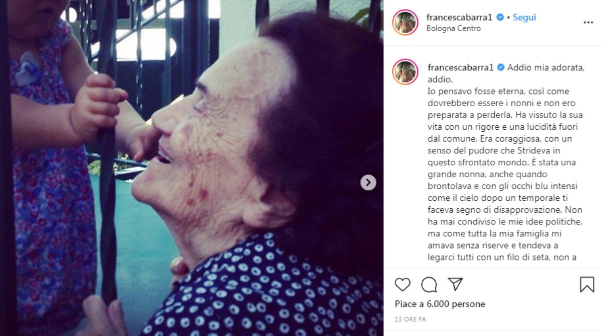 Gravissimo lutto per la giornalista Francesca Barra, volto noto della tv nonché moglie dell’attore Claudio Santamaria. Nelle scorse ore è venuta a mancare la sua adorata nonna, la signora Emma, spentasi a Bologna all’età di 98 anni. La Barra ha voluto dedicare alla sua cara un lungo messaggio, un pensiero profondo e toccante che la stessa ha pubblicato sulla propria pagina Instagram, a corredo di una bella fotogallery con protagonista ovviamente la sua nonna. “Addio mia adorata, addio – inizia così il messaggio della Barra – io pensavo fosse eterna, così come dovrebbero essere i nonni e non ero preparata a perderla. Ha vissuto la sua vita con un rigore e una lucidità fuori dal comune. Era coraggiosa, con un senso del pudore che Strideva in questo sfrontato mondo”. Francesca ricorda le “battaglie” in famiglia, ma sempre in maniera educata: “È stata una grande nonna, anche quando brontolava e con gli occhi blu intensi come il cielo dopo un temporale ti faceva segno di disapprovazione. Non ha mai condiviso le mie idee politiche, ma come tutta la mia famiglia mi amava senza riserve e tendeva a legarci tutti con un filo di seta, non a dividerci con le sue idee. Non ha mai avuto bisogno di urlare. Di mettere il broncio, di “litigare”.
