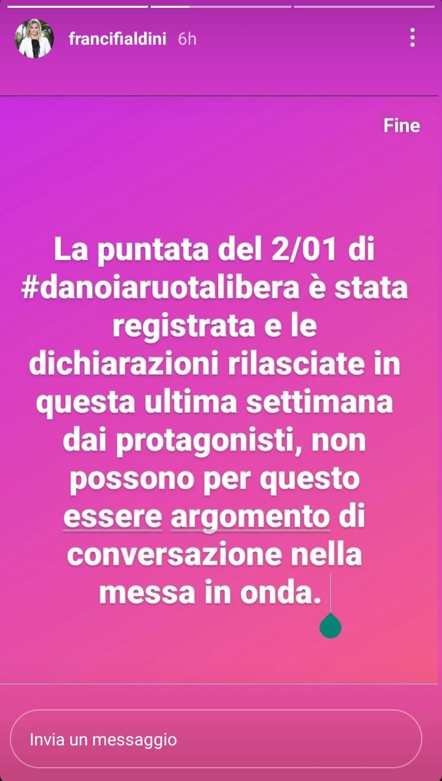 Ad intervenire, però, è stata in prima persona anche la conduttrice del programma, Francesca Fialdini. Con una storia su Instagram e tanto di screen della trasmissione in cui si legge proprio “Intervista registrata”, la conduttrice ha chiarito: “La puntata del 2/01 di Da Noi a Ruota Libera è stata registrata e le dichiarazioni rilasciate in questa ultima settimana dai protagonisti, non possono essere per questo argomento di conversazione nella messa in onda”.